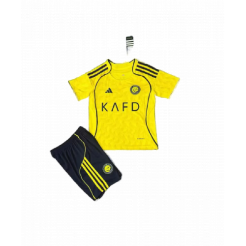 Домашняя детская форма саудовского футбольного клуба из города Эр-Рияд на сезон 2025-2026. Футболка выполнена в жёлтом цвете с синими элементами, шорты с жёлтыми вставками, украшена логотипом клуба на груди и правом бедре. В сезоне 25/26 футболка украшена тонким тиснением в виде пальмовых ветвей и мечей (элементы герба Саудовской Аравии). Три полоски на плечах — синие.