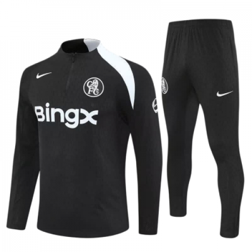 Детский тренировочный костюм Челси на сезон 2025-2026. Олимпийка на короткой молнии выполнена в черном цвете с белыми эмблемами клуба на груди. Штаны черные, с белыми эмблемами. Недорогая, универсальная детская футбольная форма из полиэстера высшего качества для высоких и невысоких мальчиков, девочек, подростков, юношей и девушек для активного спорта, для занятий футболом, тренировок в зале, на поле, в школе на физкультуре, в университете, в спортивной секции, на соревнованиях, на тренировках
