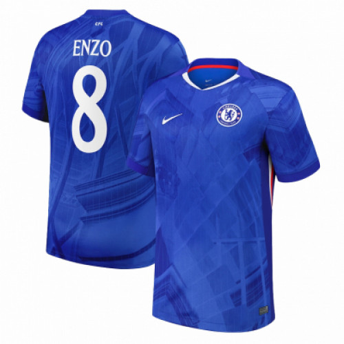 Домашняя джерси Chelsea сезона 2025/26 с персонализацией: ENZO 8 на спине. Фирменный насыщенный синий цвет с геометрическим принтом тон-в-тон, белые логотипы Nike и эмблема клуба на груди. Круглый ворот с белой окантовкой и красным акцентом внутри. Универсальный вариант для стадиона, тренировок и повседневного стиля.