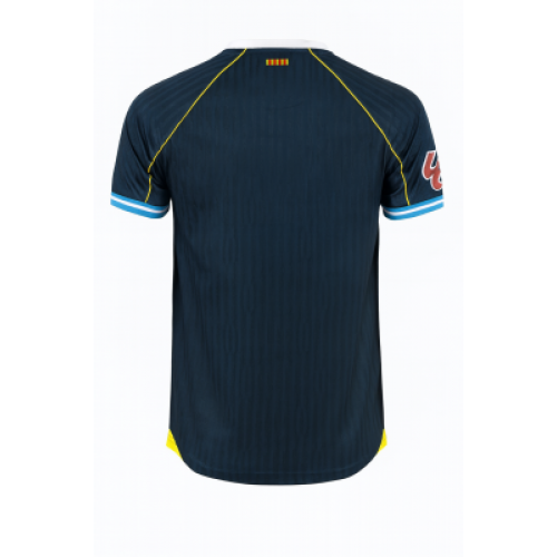 Резервная форма «Эспаньола» сезона 2025/26 от Kelme выполнена в насыщенном тёмно-синем цвете с яркими жёлтыми и голубыми акцентами, вдохновлёнными флагом Каталонии и морским духом Барселоны. Верхняя часть груди украшена градиентом солнечного жёлтого, символизирующего энергию и решимость команды. Контрастные голубые вставки на рукавах и воротнике добавляют свежести и динамики. Ткань с тонкой вертикальной текстурой создаёт ощущение движения и лёгкости. Материал с технологией отвода влаги гарантирует комфорт при интенсивных матчах. Эта форма — сочетание традиций и современности, подчёркивающее независимый и яркий характер «Эспаньола».