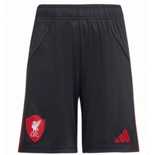 Гостевые шорты ФК Ливерпуль на сезон 2025/26. Черного цвета с красными логотипами. Материал: Функциональный, дышащий полиэстер, часто переработанный, обеспечивающий эффективное влагоотведение. Дизайн: Обычно представлены в красном (домашние), белом/темном (выездные) цветах. Дизайн часто вдохновлен историческими комплектами. Эмблема: Логотип клуба «Ливерпуль» (Птица Лайвер) нанесен или вышит на правой ноге, логотип производителя — на левой. Посадка: Эргономичный крой обеспечивает свободу движений, пояс регулируется шнурком. Применение: Подходят как для игры в футбол, так и для повседневного ношения или тренировок.