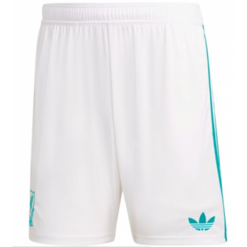 Резервные шорты "Ливерпуль" на сезон 2025/26. Выполнены в белом цвете с бирюзовыми логотипами. Материал: Функциональный, дышащий полиэстер, часто переработанный, обеспечивающий эффективное влагоотведение. Дизайн: Обычно представлены в красном (домашние), белом/темном (выездные) цветах. Дизайн часто вдохновлен историческими комплектами. Эмблема: Логотип клуба «Ливерпуль» (Птица Лайвер) нанесен или вышит на правой ноге, логотип производителя — на левой. Посадка: Эргономичный крой обеспечивает свободу движений, пояс регулируется шнурком. Применение: Подходят как для игры в футбол, так и для повседневного ношения или тренировок.