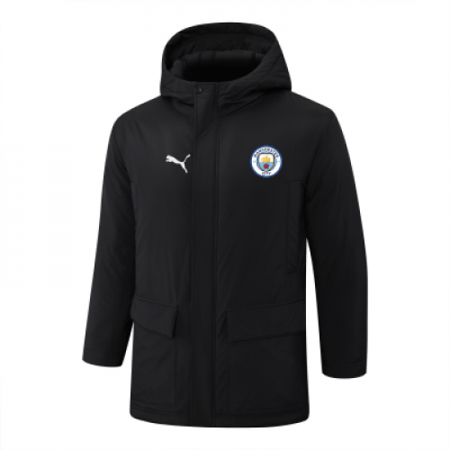 Куртка Manchester City сезона 25/26: удлинённая чёрная парка PUMA с утеплением и капюшоном. Спереди центральная молния со ветрозащитной планкой и кнопкой у горла, на груди — белый логотип PUMA и эмблема клуба. Внизу два вместительных кармана с клапанами, прямой силуэт и лаконичный городской дизайн.