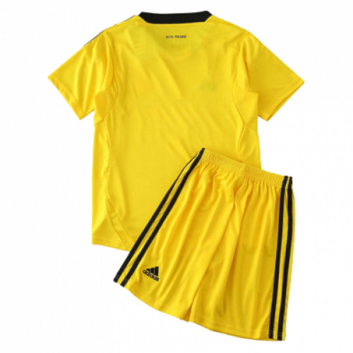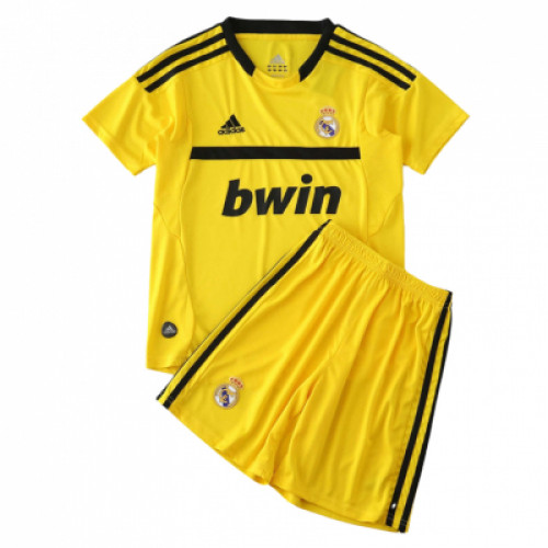 Вратарский комплект Real Madrid сезона 2011/12: ярко-жёлтая джерси Adidas с чёрными полосами на плечах и контрастной горизонтальной вставкой на груди, спонсор bwin по центру и эмблема клуба. Шорты в тон с чёрными лампасами и гербом. Узнаваемая классика для коллекции и игры.