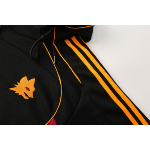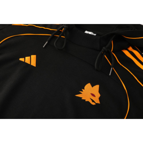 Черный спортивный костюм «Рома» с капюшоном на сезон 2025/26 — это стильная и практичная модель, сочетающая уличный стиль и профессиональную футбольную эстетику. Цвет:черный. В качестве акцентов используются классические бордовые («джаллоросси») или золотистые элементы на логотипах и фирменных полосках. Капюшон: Глубокий, анатомической формы с регулировочными шнурками. Обеспечивает отличную защиту от ветра и легких осадков. Материал: полиэстер. Ткань мягкая внутри, хорошо сохраняет тепло и при этом эффективно отводит влагу.